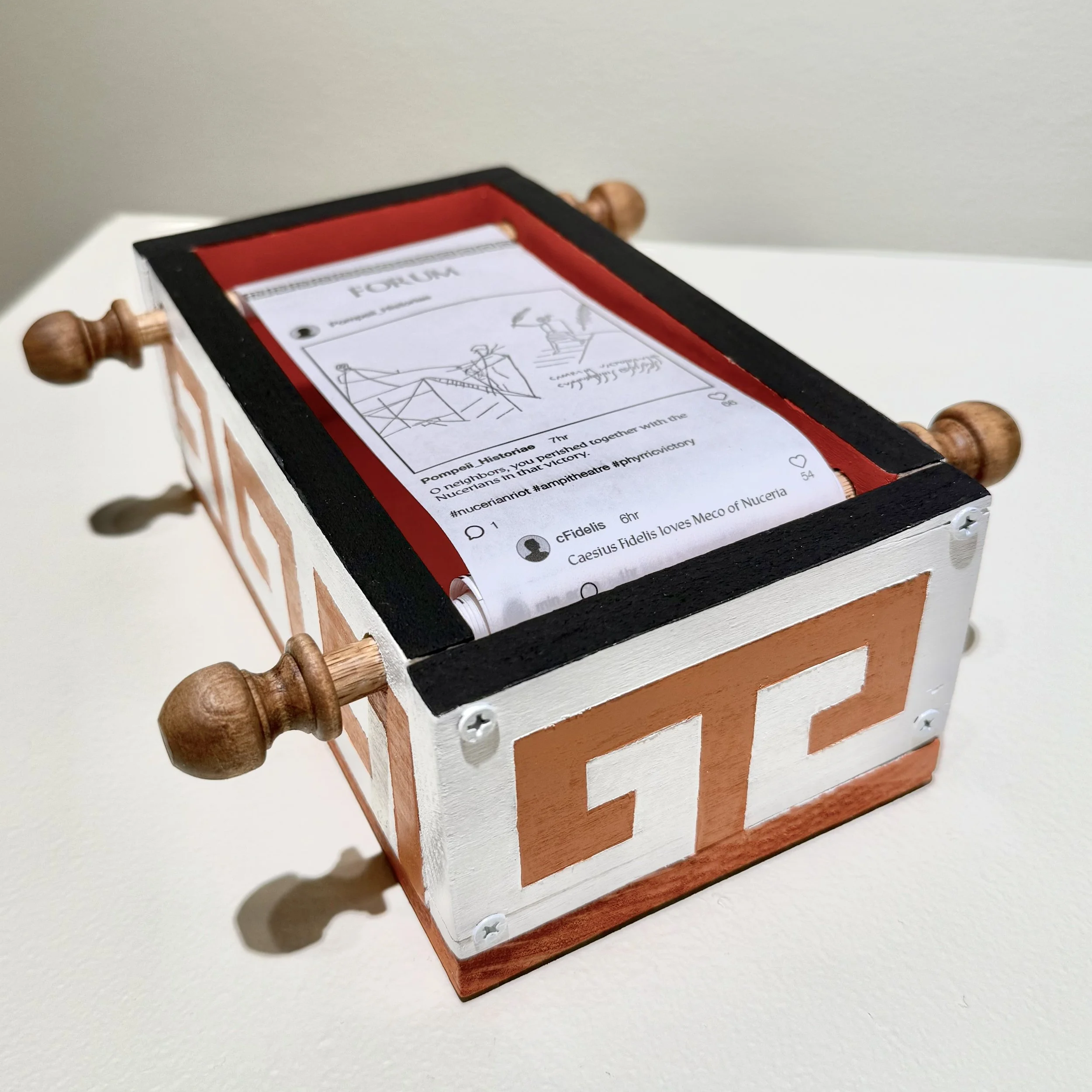 The “app” itself is entirely physical, printed on a scroll both as a reference to how almost all writing was stored on scrolls at the time and to how we modern humans spend our days scrolling social media. The box allows the viewer to physically scroll through the scroll, and serves as a low-tech phone.
